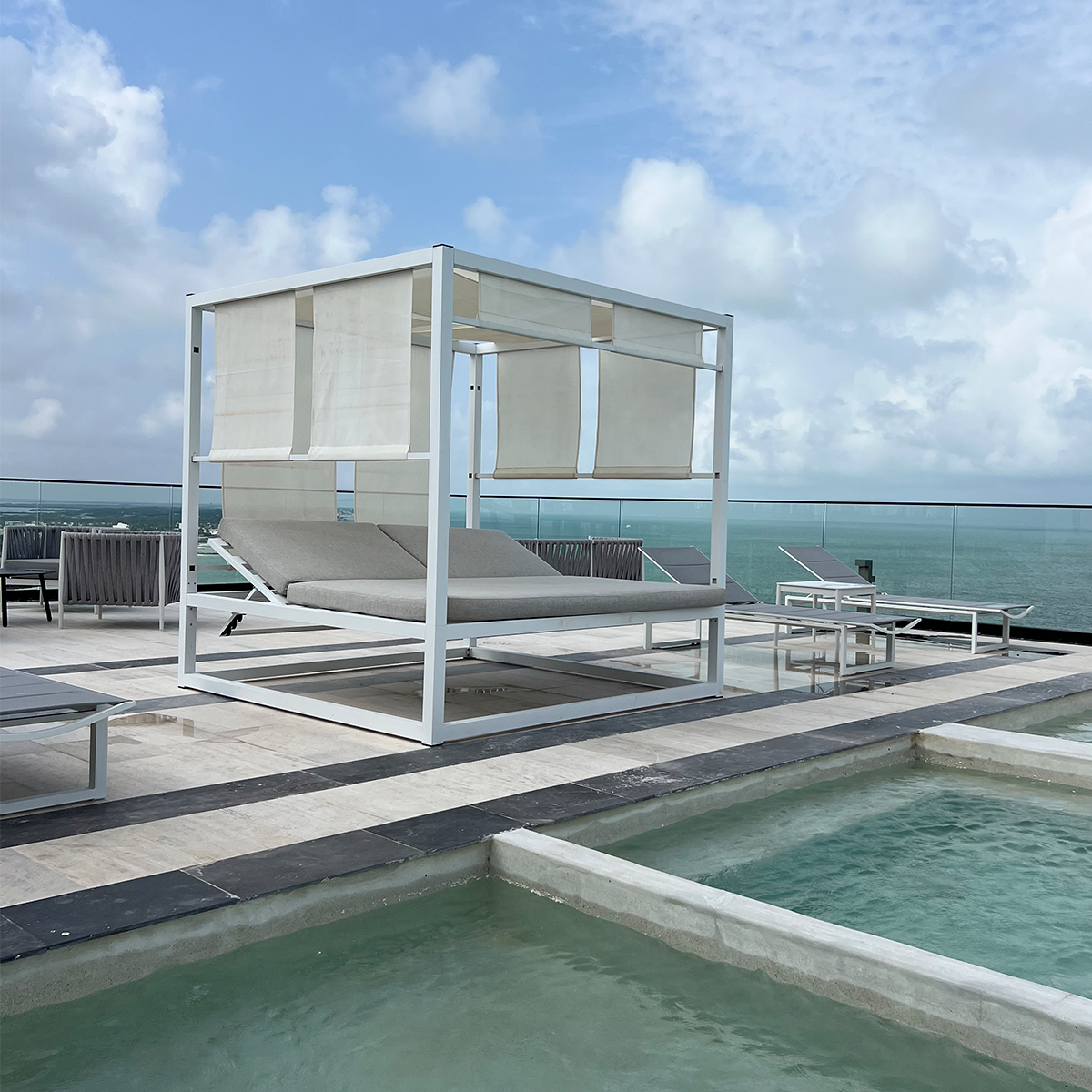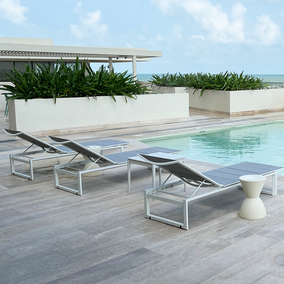 Las estructuras de aluminio anodizado, combinadas con textiles certificados garantizan resistencia frente a los retos del entorno costero: sol, humedad y brisa marina. Así, cada pieza mantiene su belleza y rendimiento con el paso del tiempo.